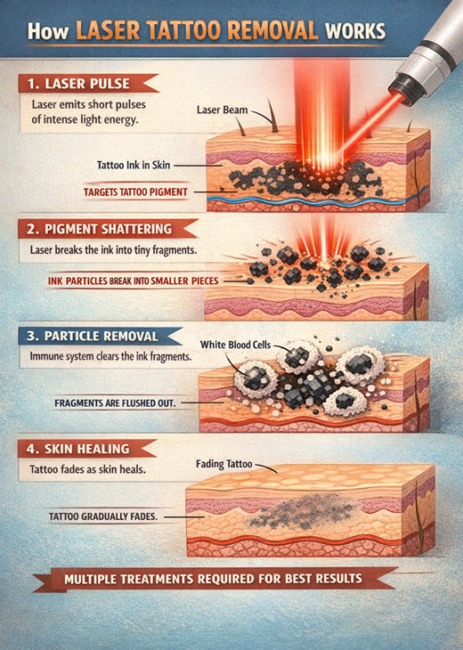 As the laser energy penetrates the skin, it passes harmlessly through the outer layer and is absorbed by the tattoo pigment in the dermis. The rapid absorption of energy causes the ink particles to heat up and shatter into microscopic fragments. This process happens almost instantly and does not “burn” the tattoo away. Instead, it relies on light energy selectively breaking apart the pigment.